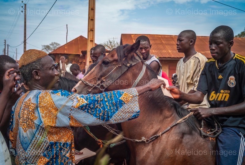 Djougou, Benin. Race day. Moussolomi Congacou, president of the riders' association, rewards the "jockeys" with a small envelope of money.