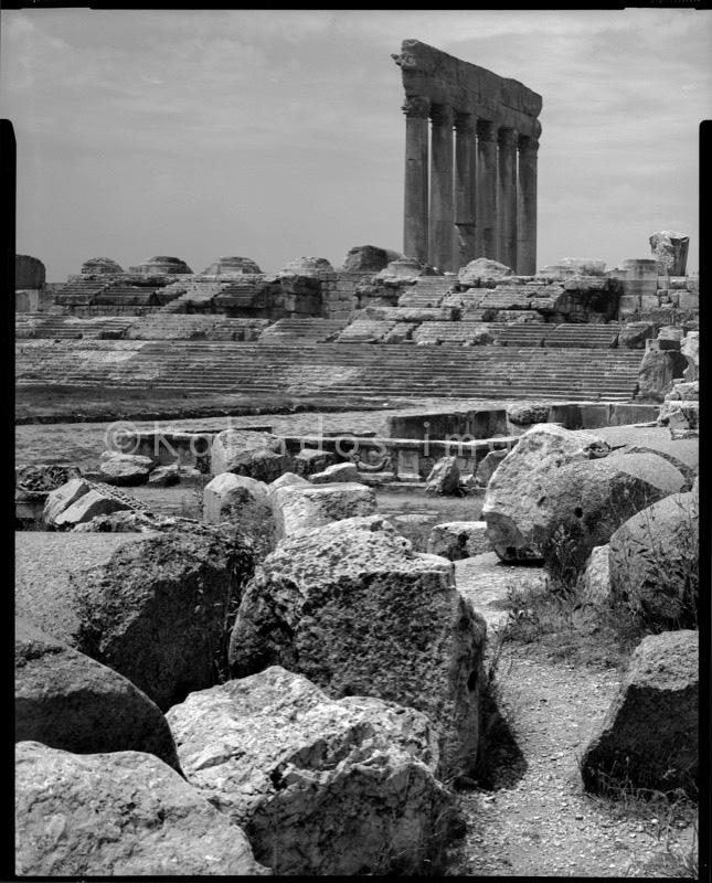 Baalbek, Lebanon. Archaeological site of the ancient city. Temple of Jupiter. The monumental three-flight staircase leading up to the temple for the priests of the cult is clearly visible. With the exception of the great temple at Tarsus, the Temple of Jupiter at Baalbek is the largest in the Roman world. It was built over an area of 4,224 square metres. All that remains are six columns with a diameter of two and a half metres at the base and a height of twenty-two metres.