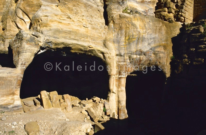 Jordan, Petra. The urn tomb is carved into the cliff of the Jabal al- Khubtah. It's part of the Royal Tombs north of the theatre and facing the Qasr al-Bint temple. The urn tomb with it's hellenistic style facade is probably the tomb of a prince or a king (maybe Malichos II). It was transformed into a church in the year 447 AD. The staircase, supported by two levels of archs, that leads to the monument is from the byzantine era. Here is the bottom left side of the tomb with caves/tombs.